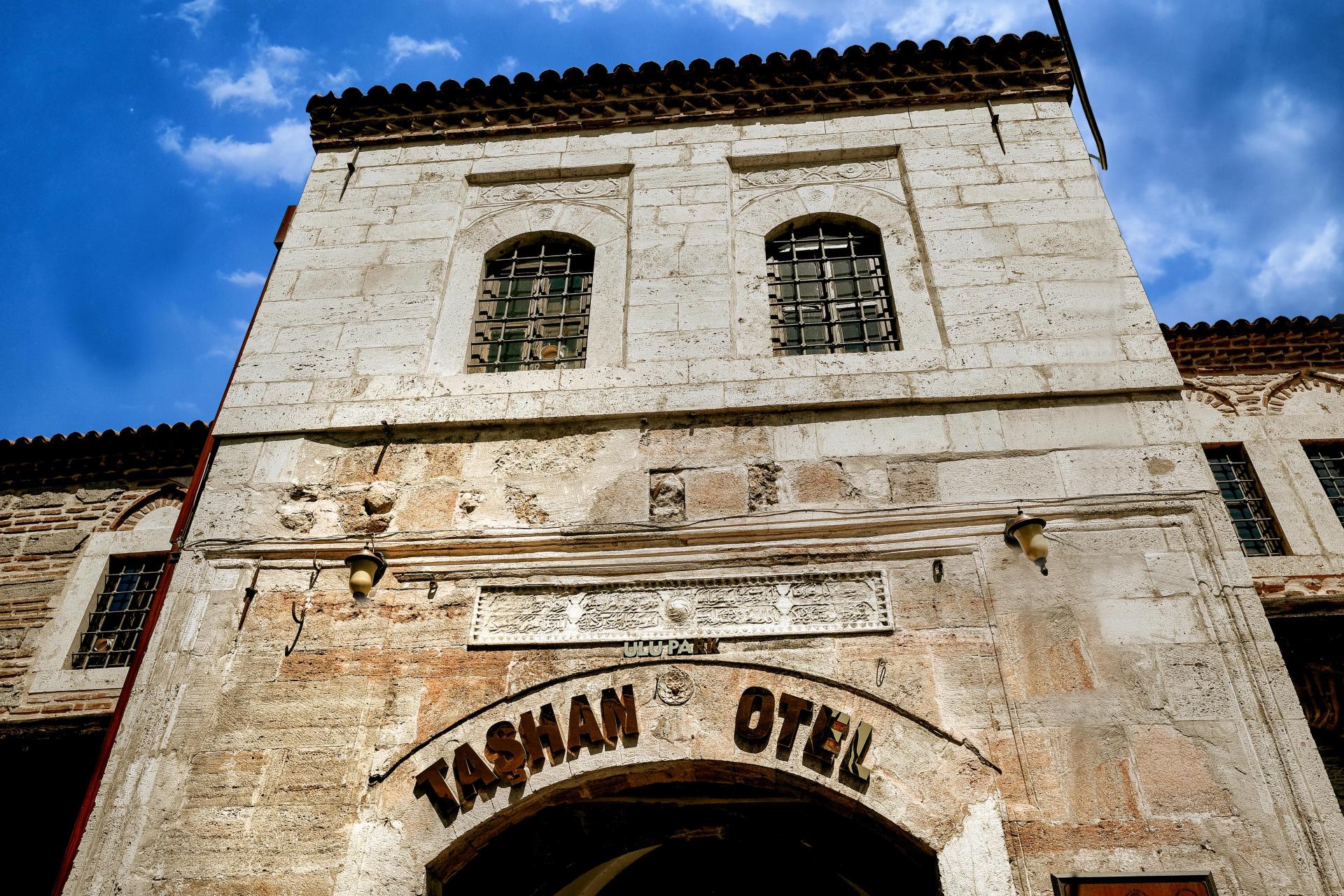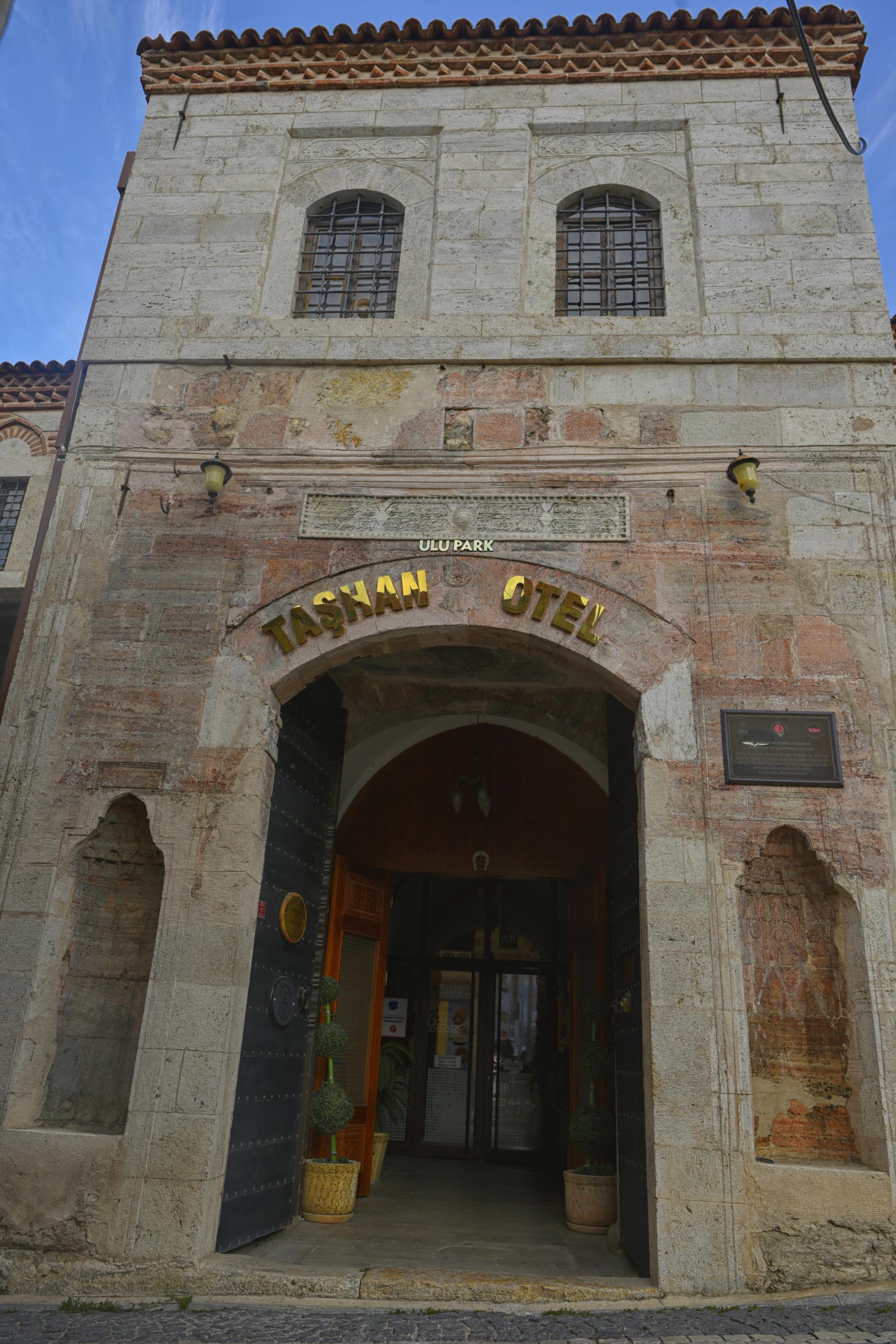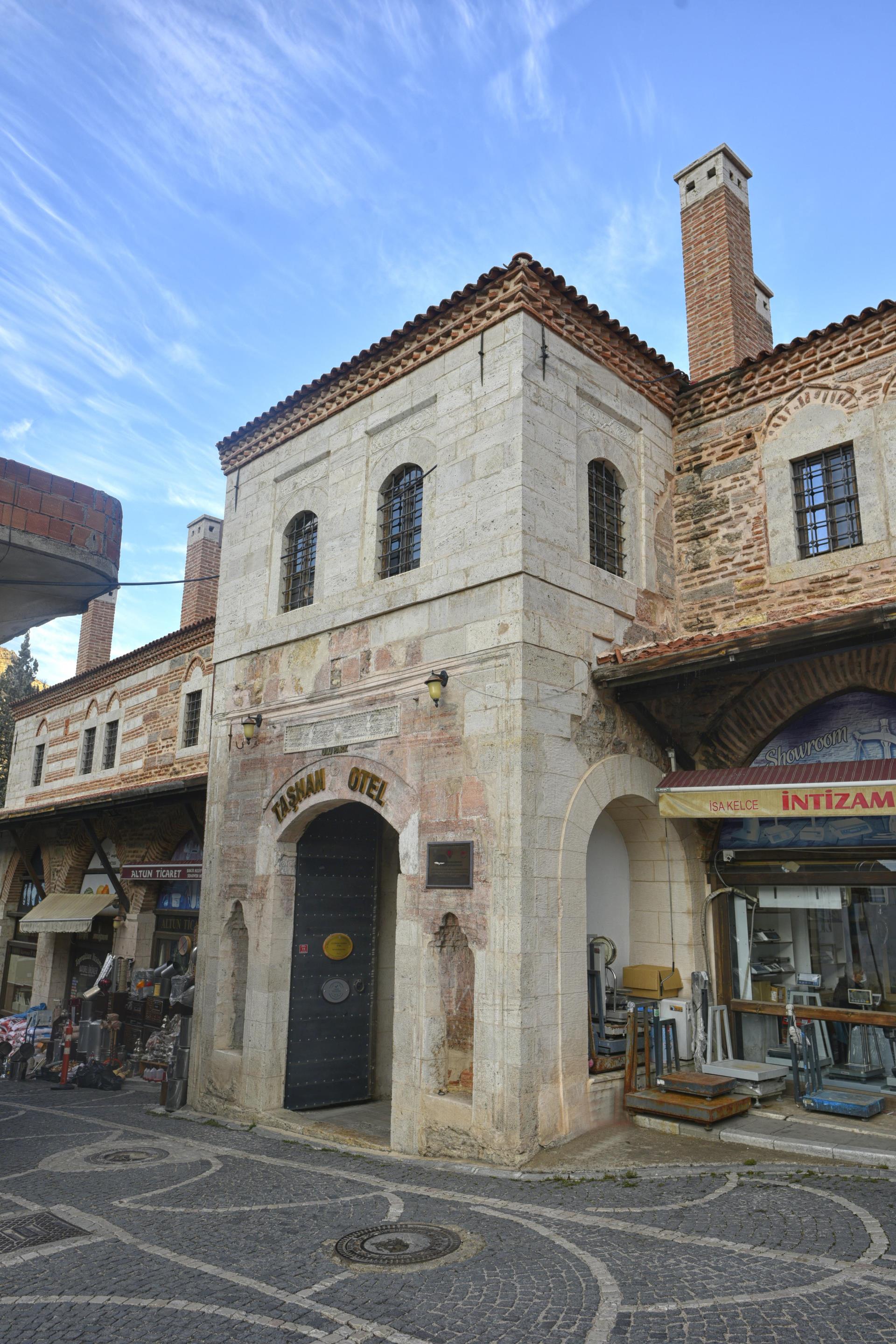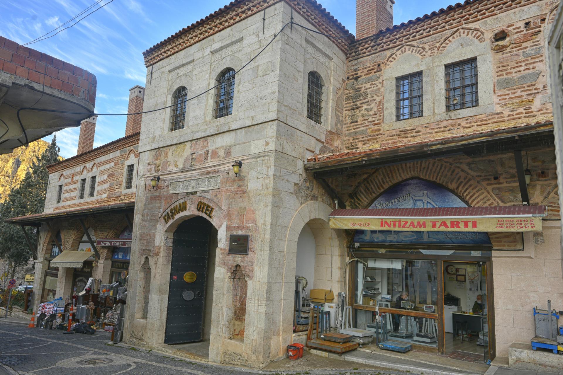 Amasya Mutasarrıfı Rahtuvan Hacı Mehmet Paşa tarafından 1699 yılında yaptırılmıştır. İki katlı olarak yapılan taşhan dikdörtgen planlı ve iç avluludur. Giriş kapısı basık yay kemerli olup inşa kitabesi kapı üzerinde yer alır. Kitabeye göre yapıyı Ferman Kalfa adlı bir usta yapmıştır. Beden duvarları kesme taş ve tuğla ile inşa edilmiştir. Amasya Valiliğince esaslı bir şekilde restorasyonu yapılan taşhan halen otel ve restoran olarak hizmet vermektedir.